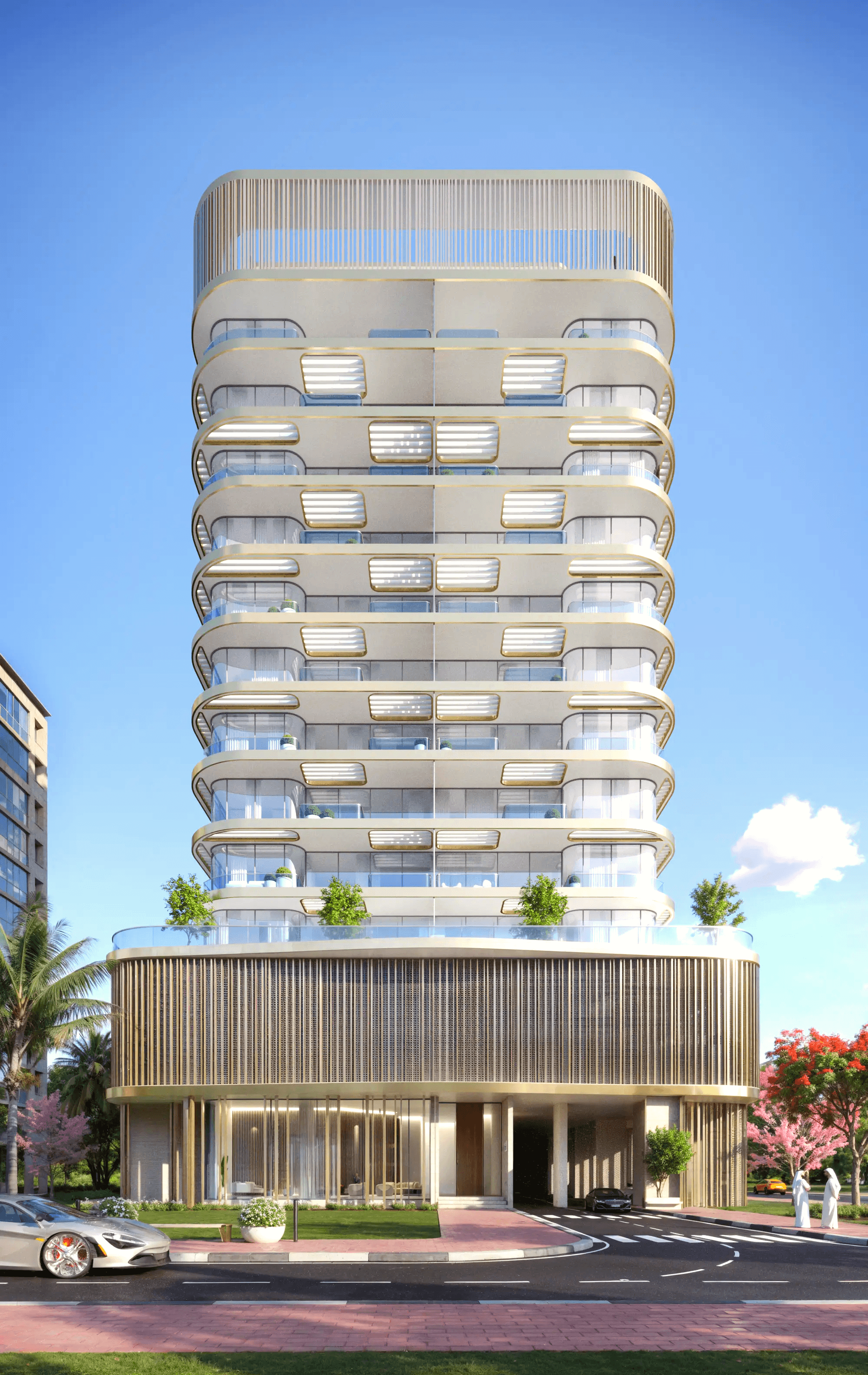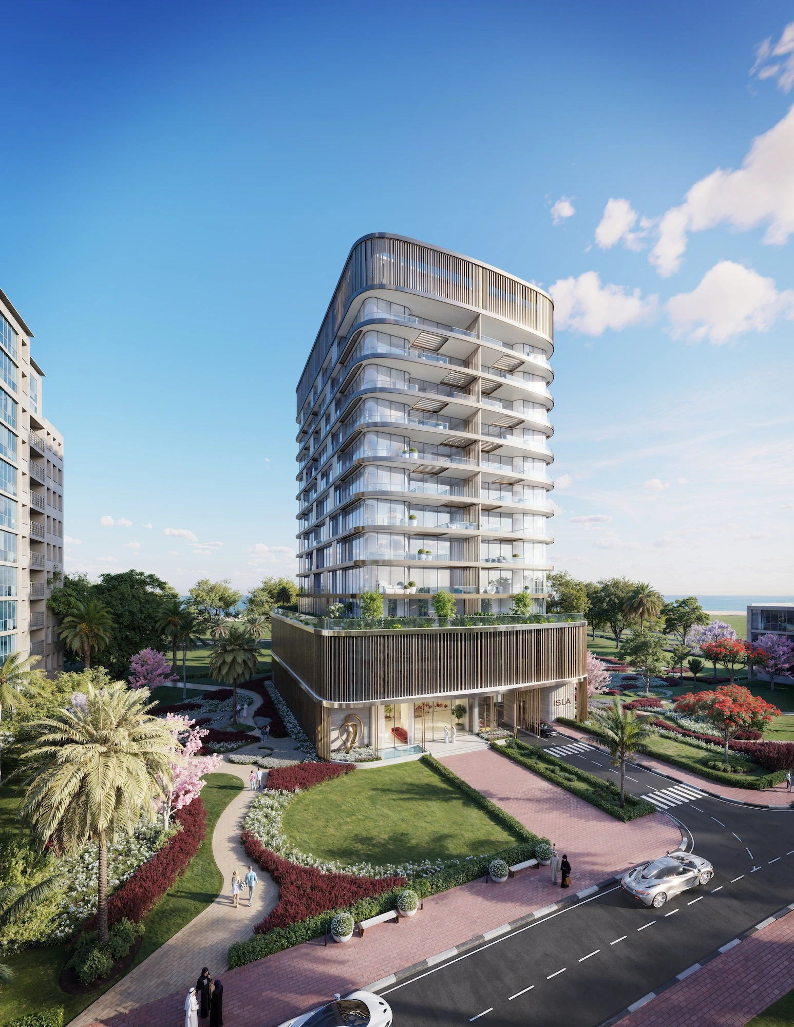 A living vertical garden breathes life into the façade, while curved terraces frame ocean vistas and a sculptural rooftop canopy offers sanctuary above the city.
