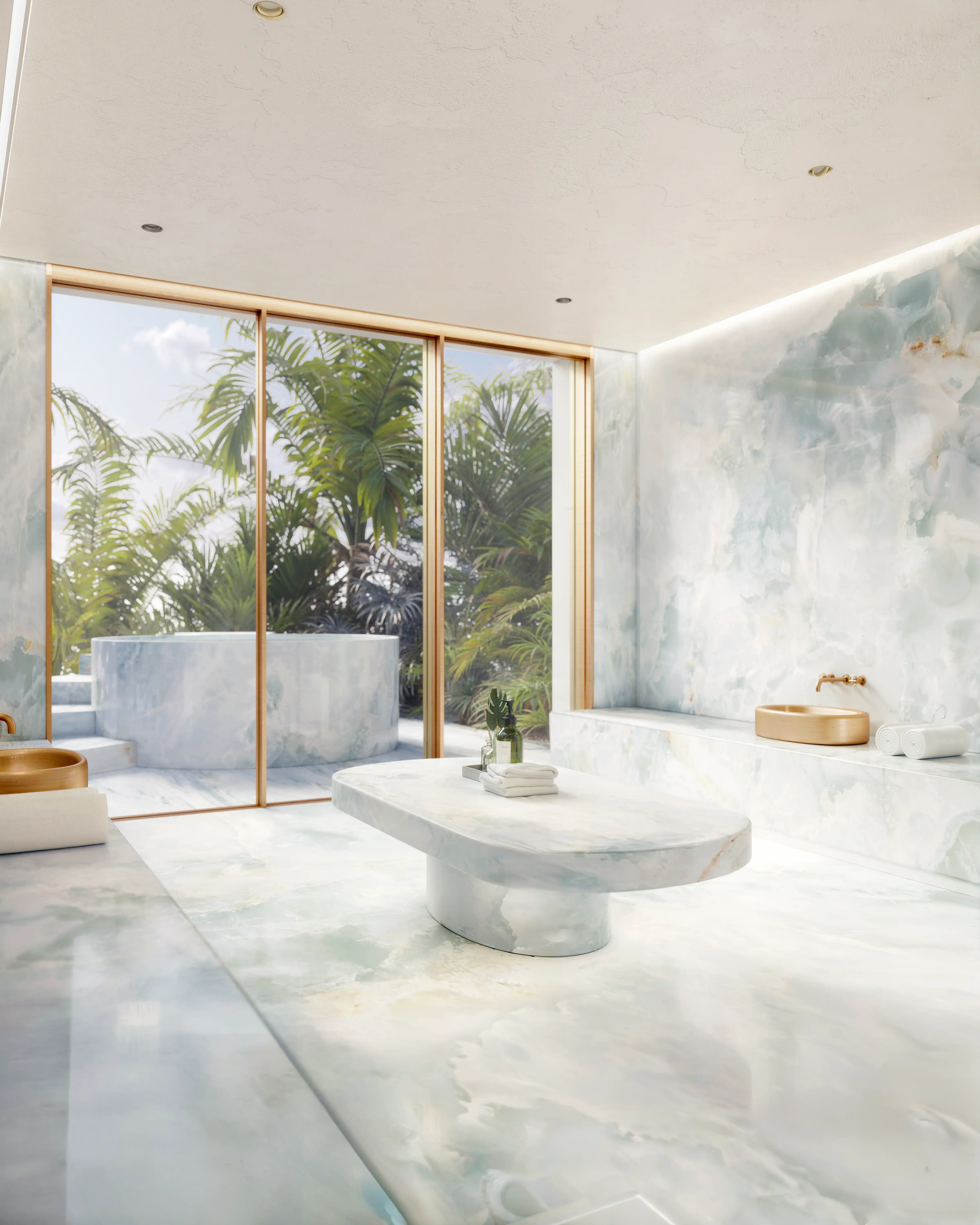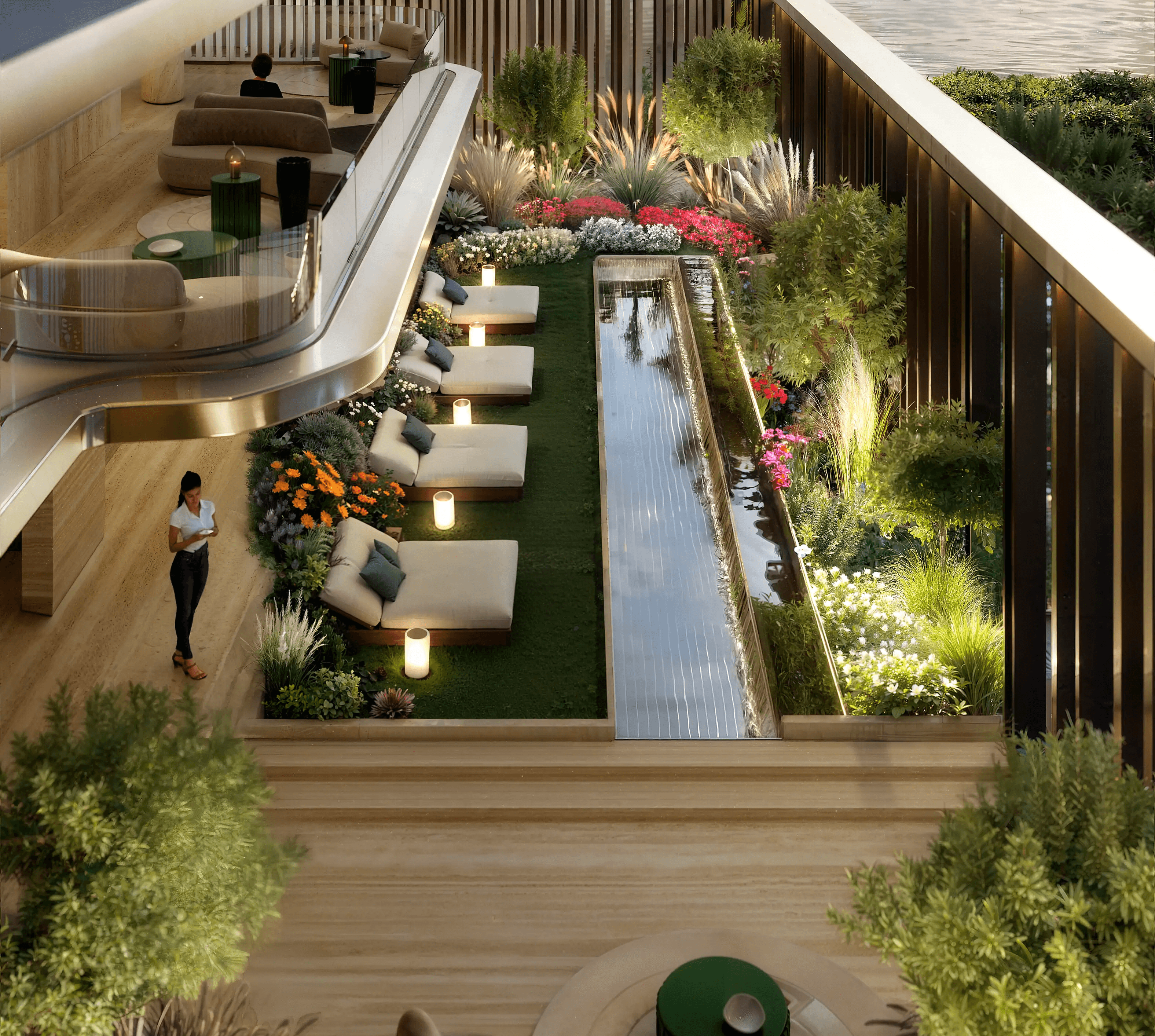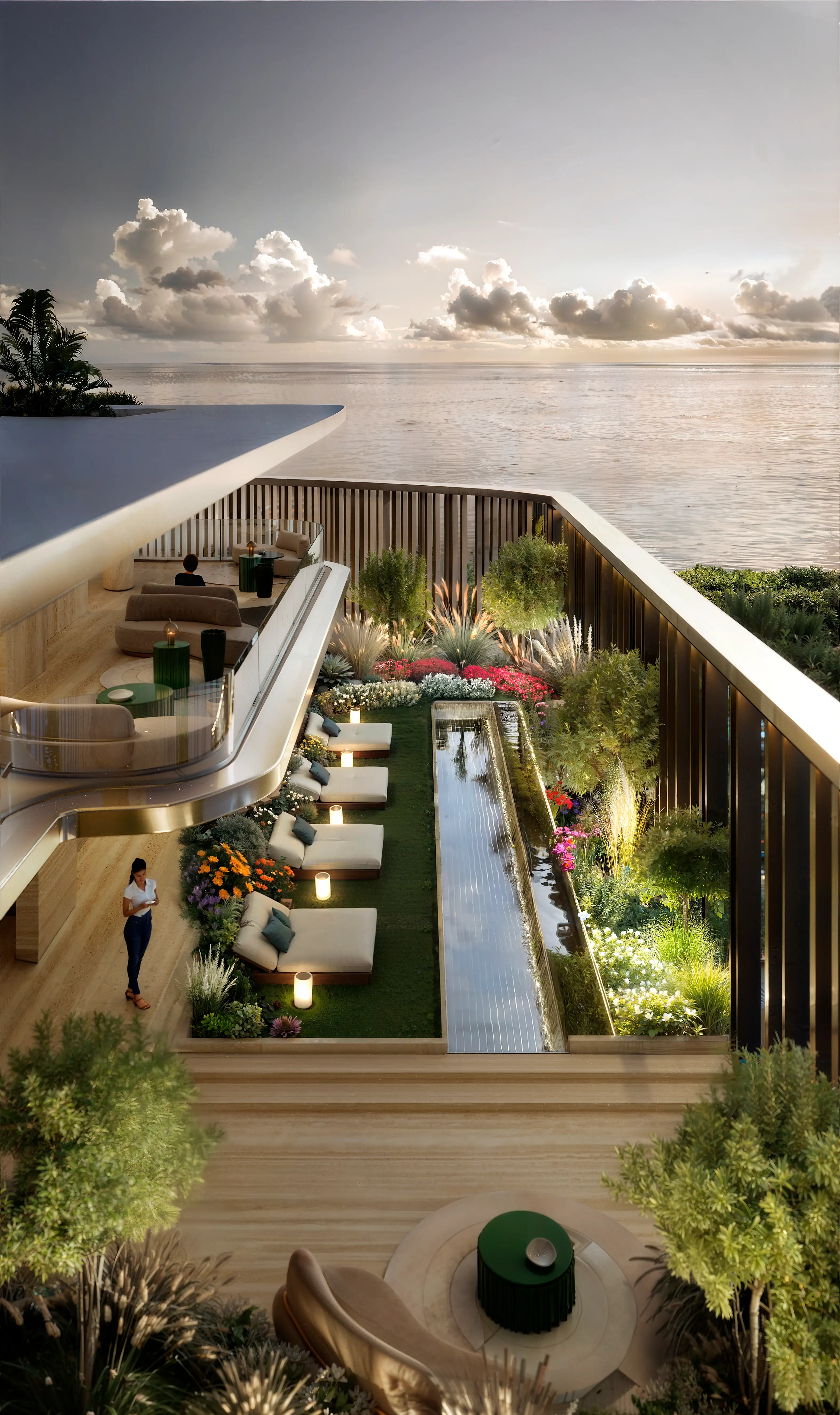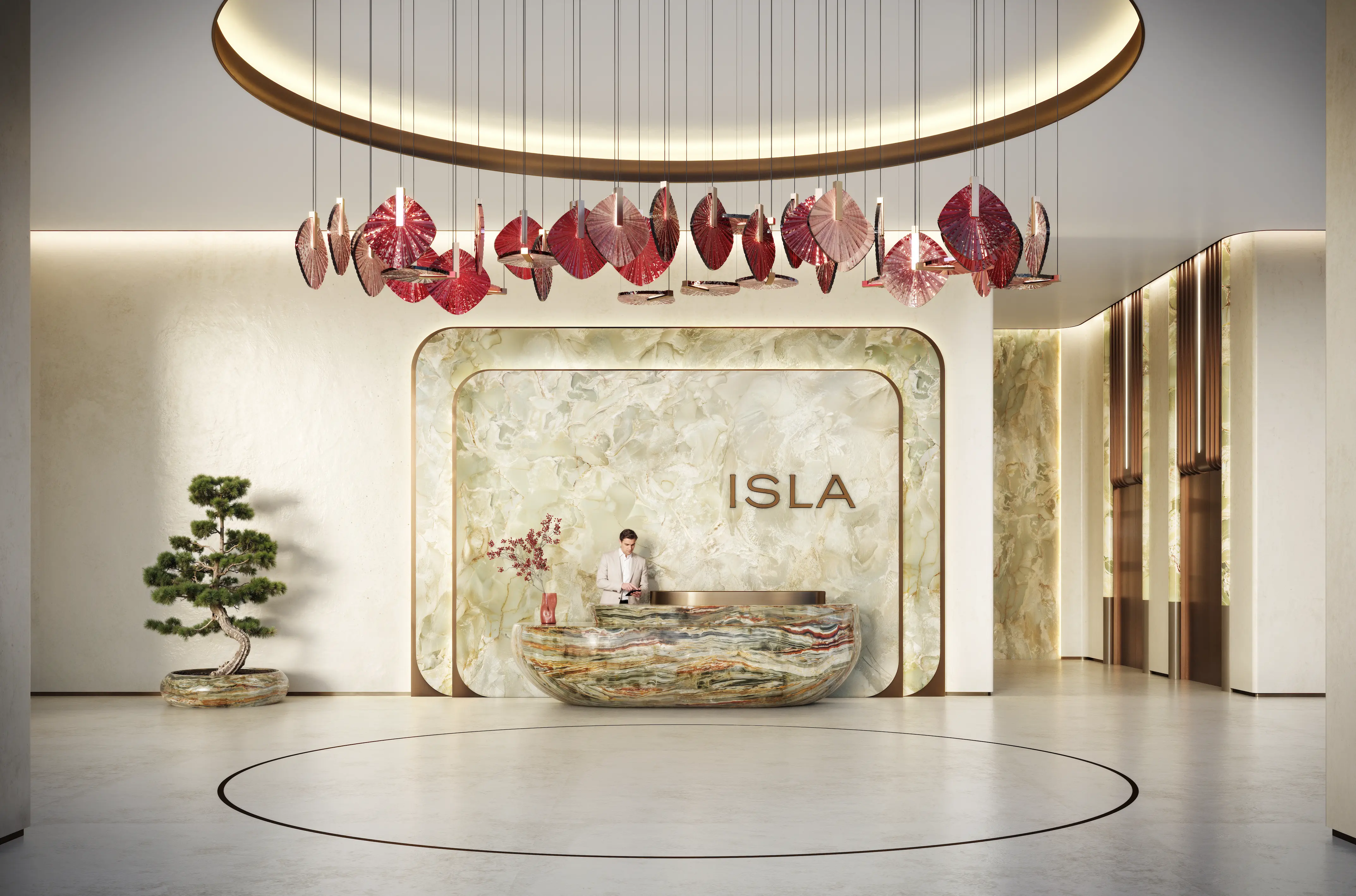 A double-height lobby welcomes you with artistic sculptures, a reflective mirror pool, and 24/7 concierge service—where a dedicated drop-off entrance and elegant seating areas set the tone for refined island living.